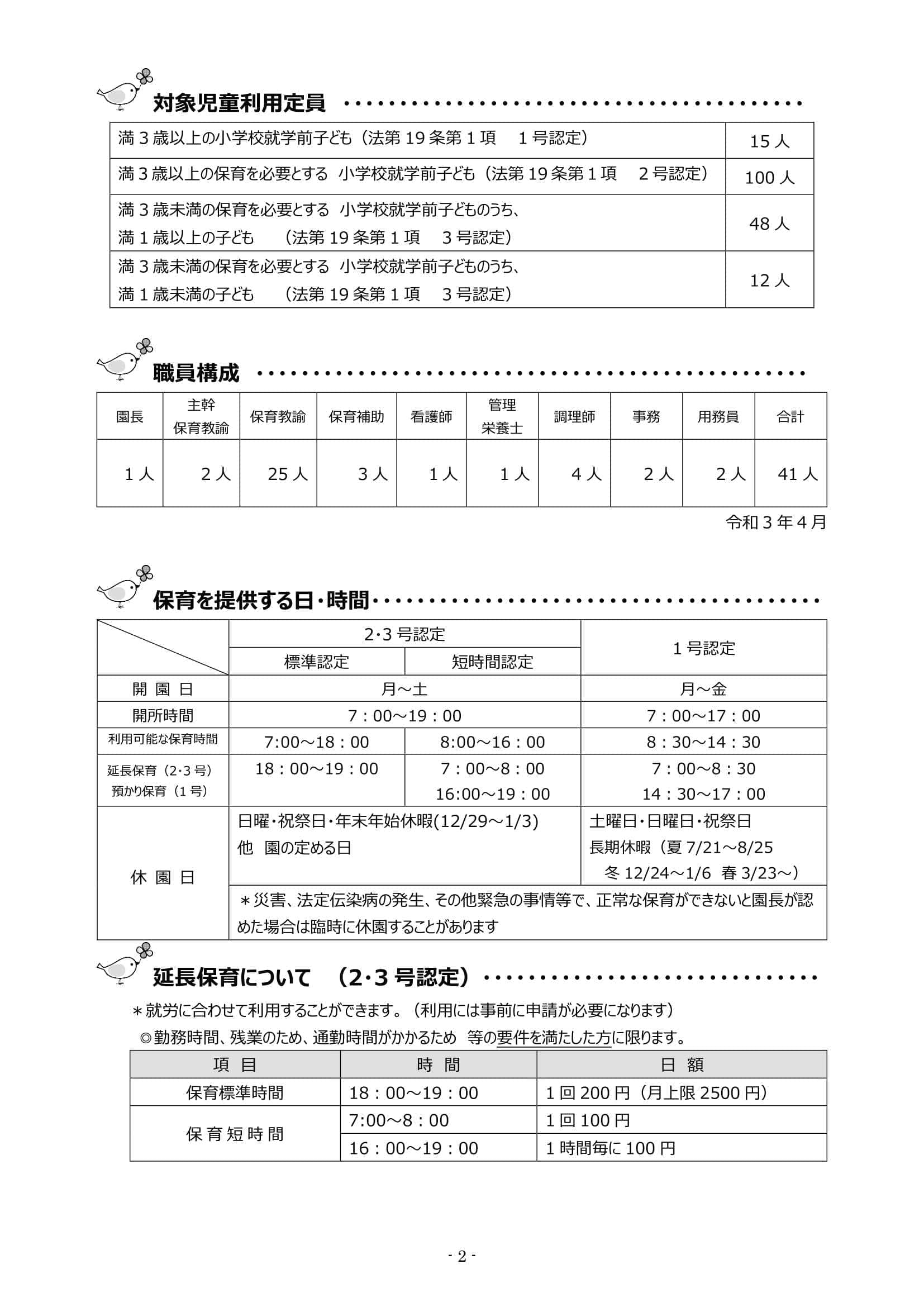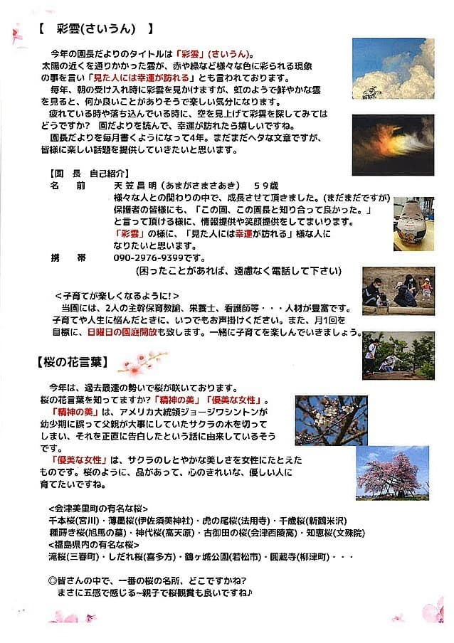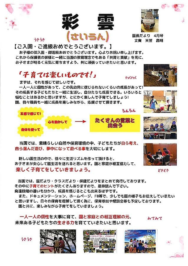 現在、コミュニケーションがうまく取れない、すぐ挫折する等の社会性の弱さが問われております。そのためにもまずは乳幼児期に社会性が培われることが大事なのではと考えております。私たちは、子どもたちが園に来るのが楽しいと思えるような教育・保育を日々心掛けてまいります。
